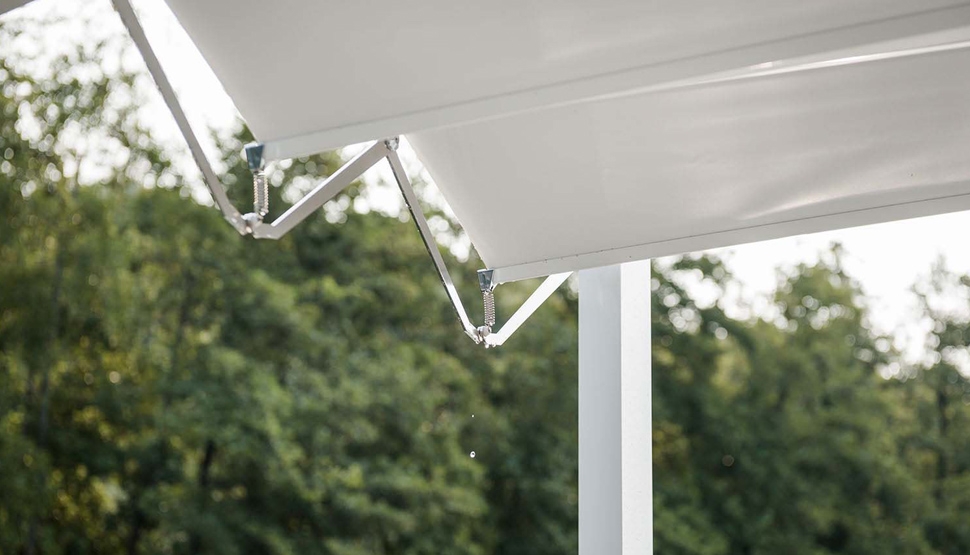 Individualna, usločena oblika zložljivega ostrešja z inovativnim dizajnom postavlja nove smernice in uporabnost. Ostrešje za garantiran odtok vode ne potrebuje naklona oz. padca in je funkcionalna rešitev za zunanje prostore z omejeno višino.